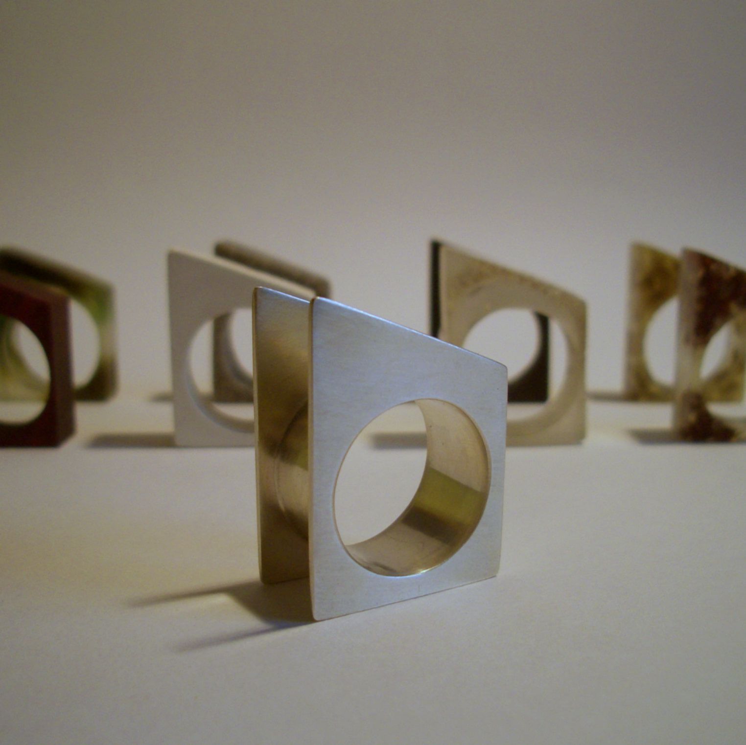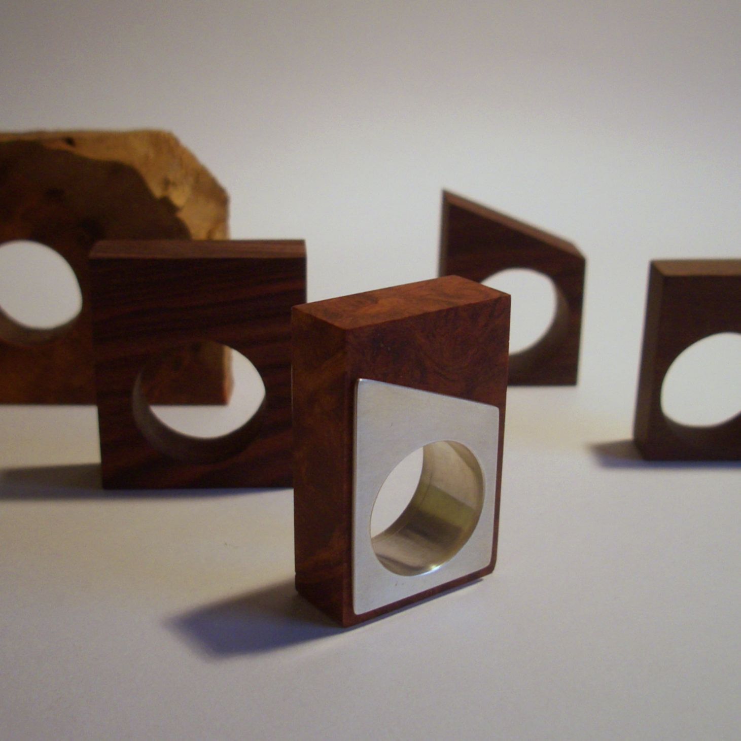 Diese Schmuckobjekte spielen mit der Variation. Verschiedene "Innenleben" werden nach Stimmung und Gefühl ausgewechselt. Ein Teil der Innenleben ist aus Kunstharz, in denen unterschiedliche organische Objekte eingebettet sind. Sie werden von einem Wechselring eingerahmt. Ein anderer Teil besteht aus unterschiedlichen Holzelementen, die wiederum den Wechselring einrahmen -so wachsen sie über die Kanten hinaus. Der Wechselring kann sowohl als Fingerring oder auch als Kettenanhänger getragen werden.